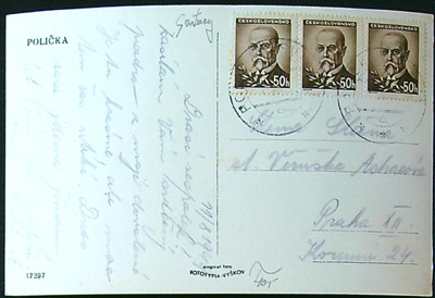 zadní strana popsaná, tři známky, razítko, uprostřed skvrna,