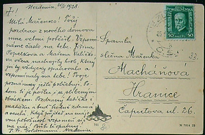 zadní strana popsaná, známka, razítko